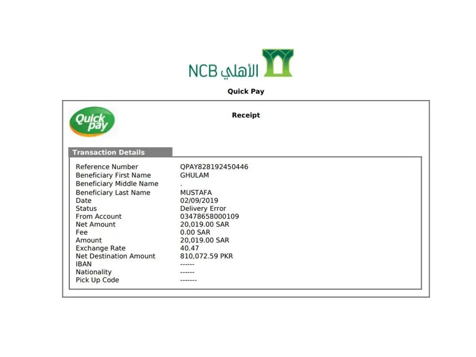 I transferred money to my Pakistan account using NCB mobile application. Below are the transfer details;