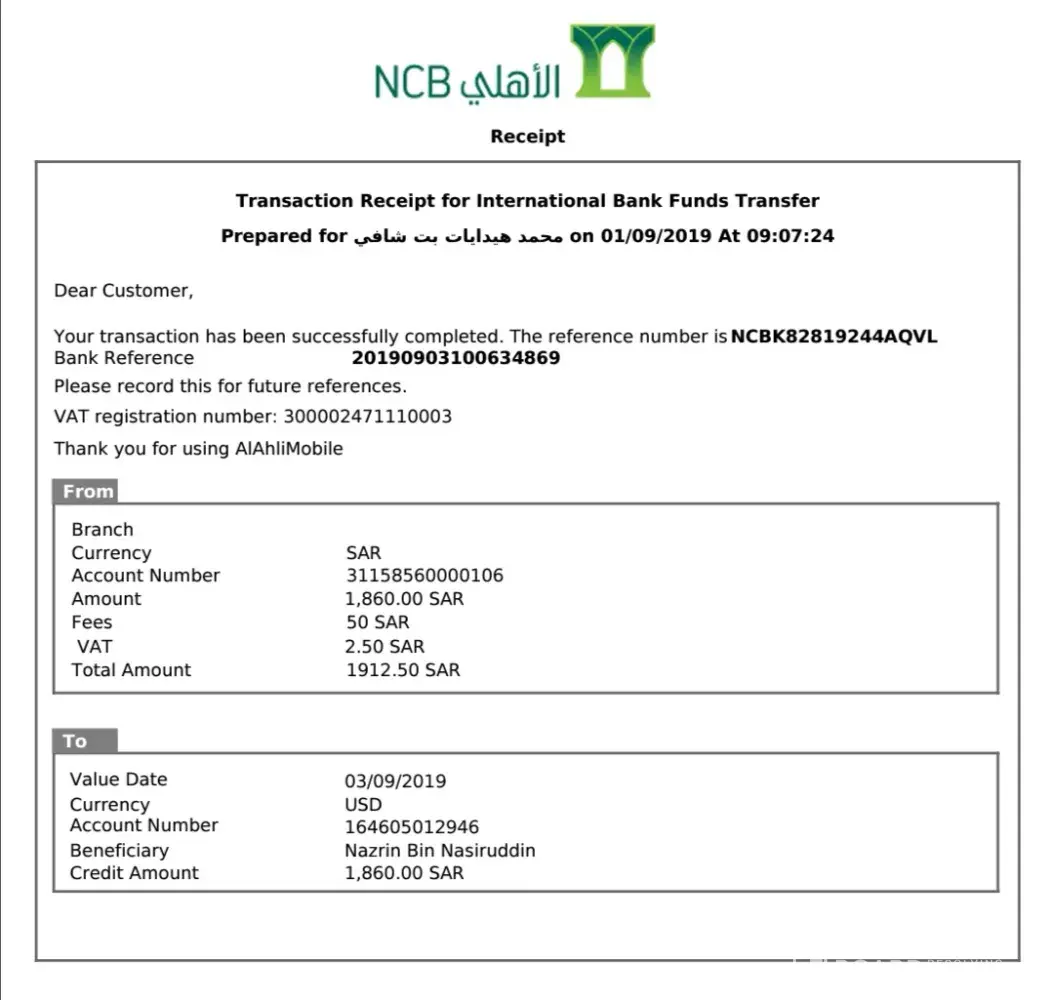 Ivm Muhammd Hidayat Bin Shafie (Iqama: [protected])had made two international remittance transactions last 3 week ago from my Al Ahli account to two beneficiaries in Malaysia. However, until now both of them still didn't receive the money. I already call the correspondence banks in Malaysia, but the bank said, they still didn't receive the money from NCB.