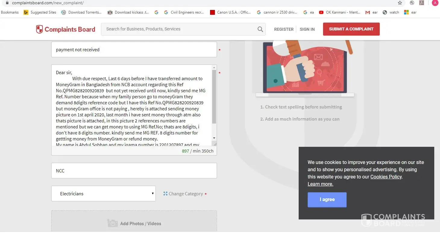 With due respect, Last 6 days before I have transferred amount to MoneyGram in Bangladesh from NCB account regarding this Ref No. QPMG828200920839 but not yet received until now, kindly send me MG Ref. Number because when my family person go to moneyGram they demand 8digits reference code but I have this Ref No. QPMG828200920839 but moneyGram office is not paying, hereby is attached sending money picture on 1st april 2020, last month I have sent money through atm also thats picture is attached, in this picture 2 references numbers are mentioned but we can get money to using MG Ref. No; thats are 8digits, I don't have 8 digits number. kindly send me MG REF. 8 digits number for gettting money from MoneyGram or refund money.