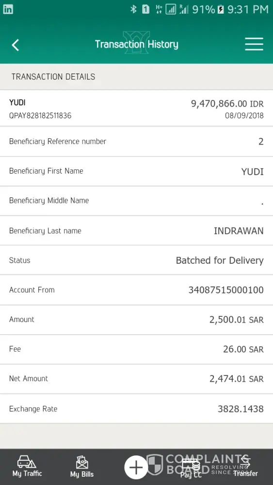 Hy Dear sir, I am facing a problem with quick pay money transfer service . As I send money 3500 SAR to Pakistan on IBAN account number .But still i have not received money in Pakistani have put a complaint in the same quick pay bank but the issue is not yet solved . So pleas help me i shall be very much thankful to u ... My details are a...