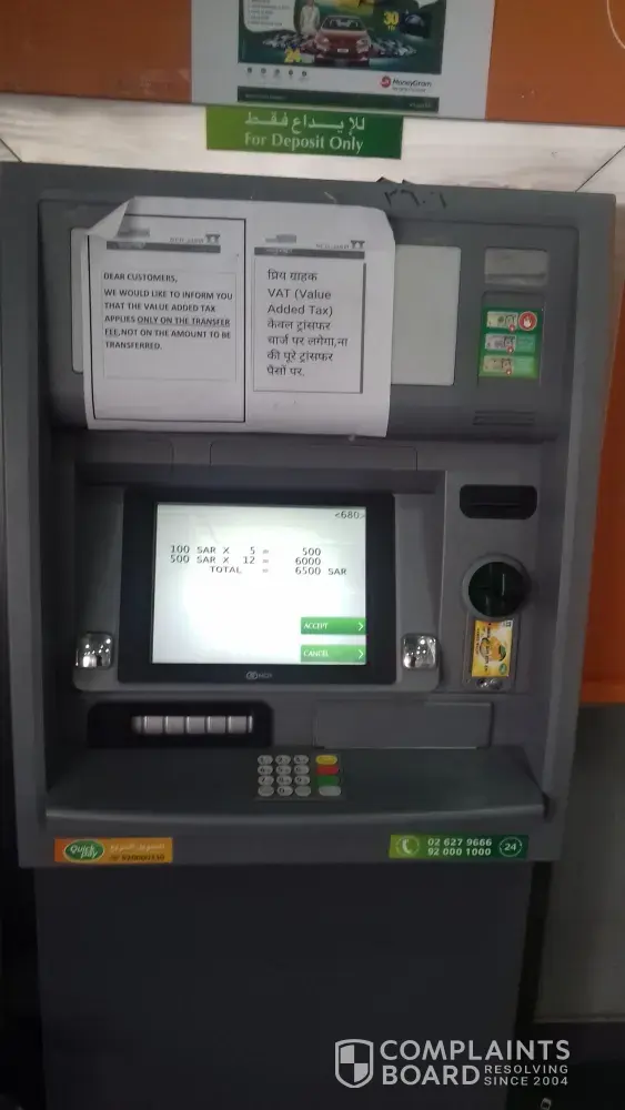 I tried depositing my sr 6500 at an atm deposit machine, atm id #ncrerg3003103608, national commercial bank, eastern region, jubail. My money was taken inside by machine and also debit card, and it was not deposited to tha account neither it was cancelled and debit card was also kept inside the machine.