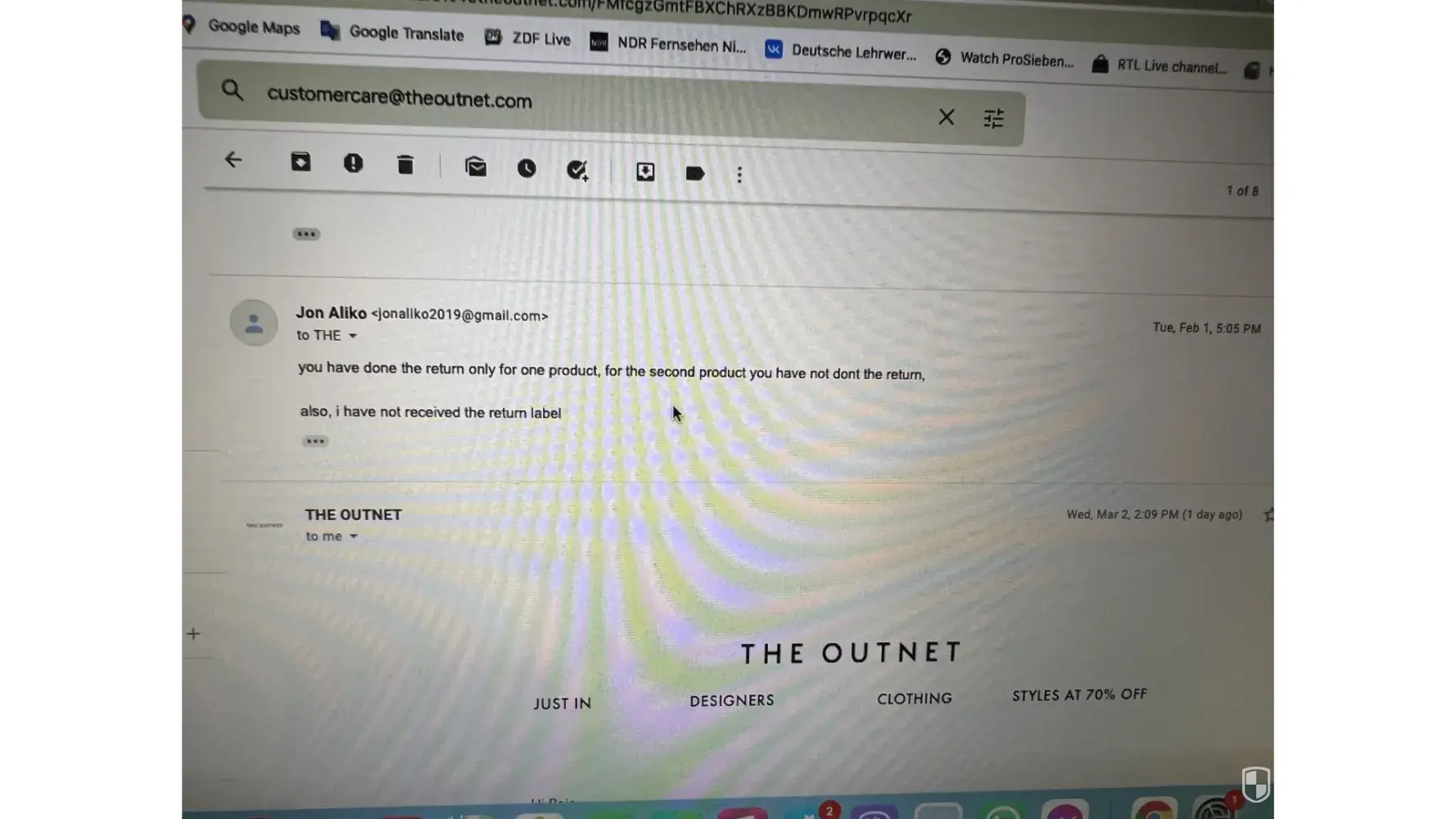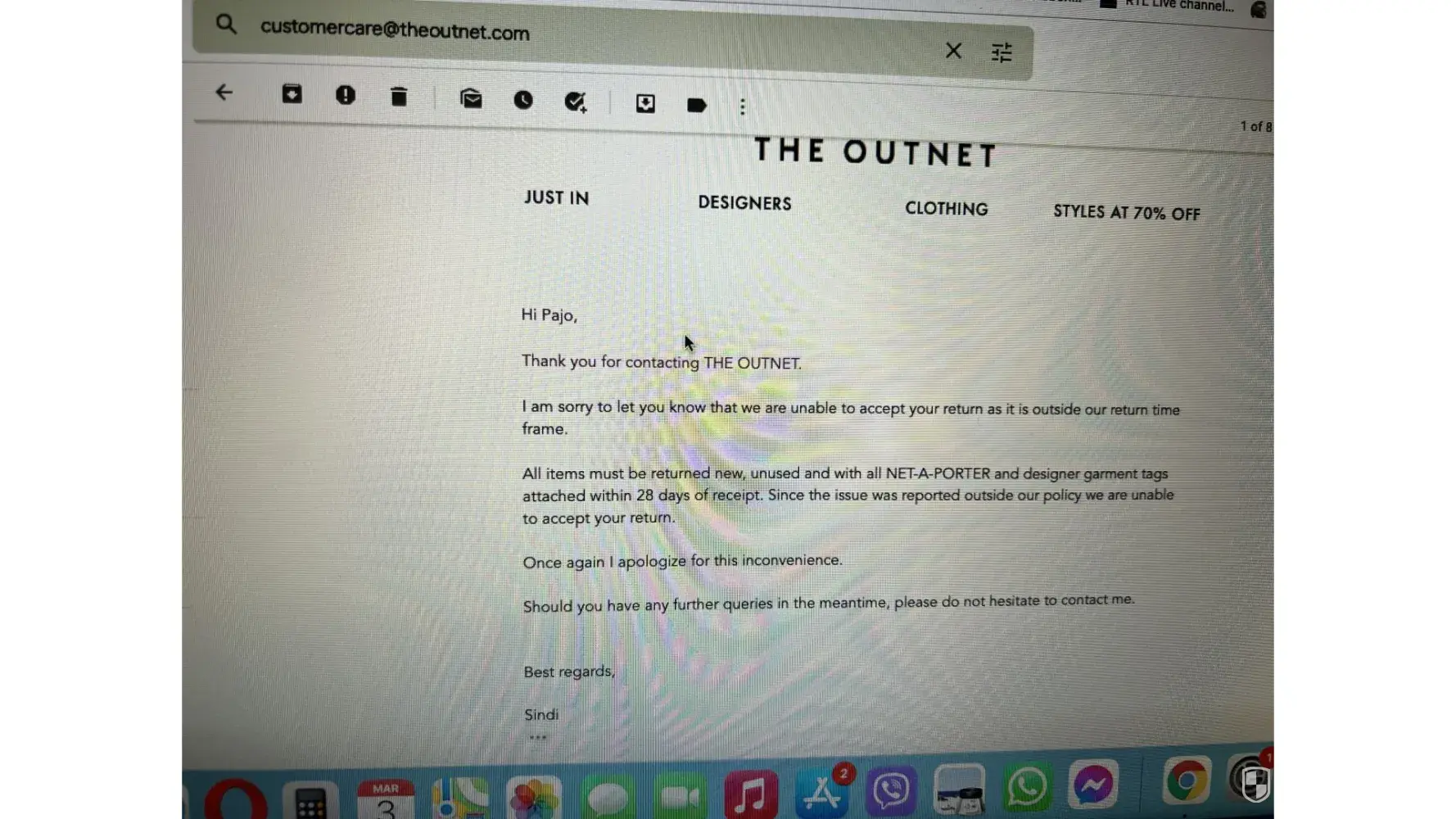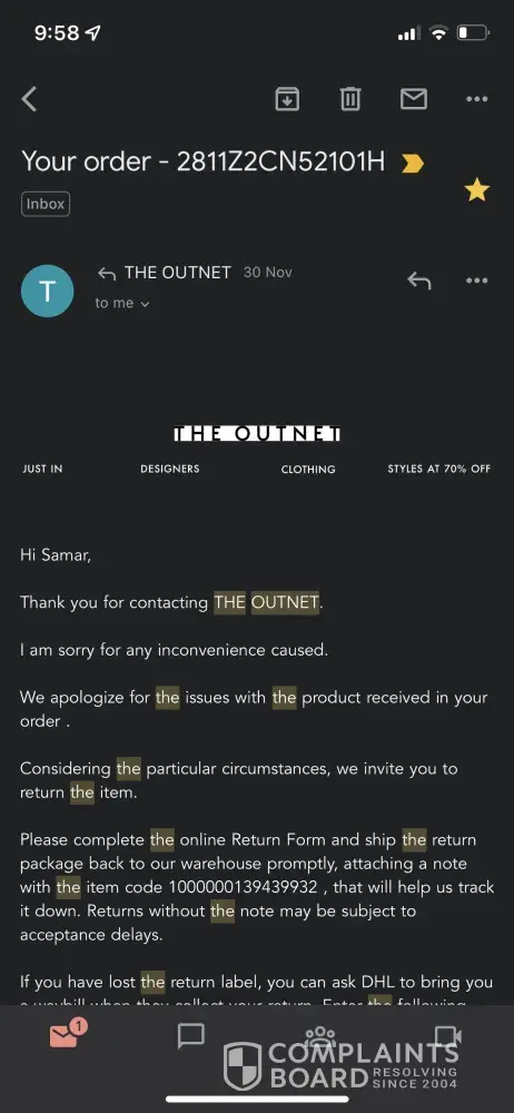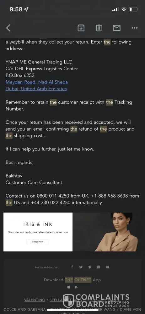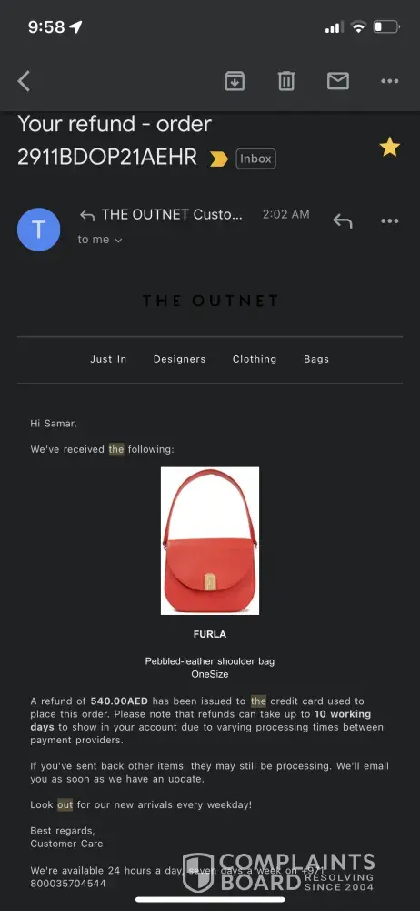 Below i have attached emails with theoutnet, but the chats and the phone call i have no photos.