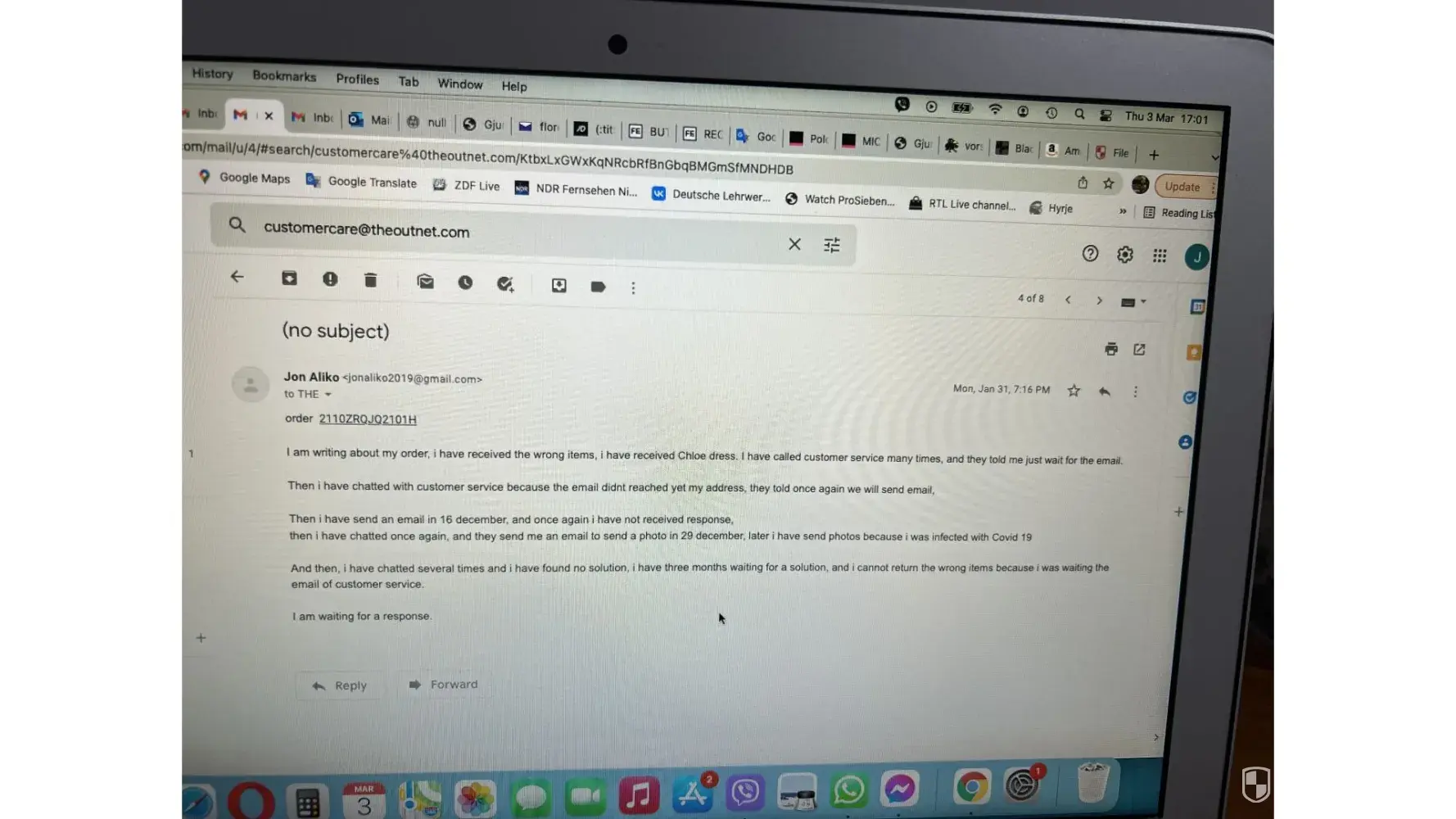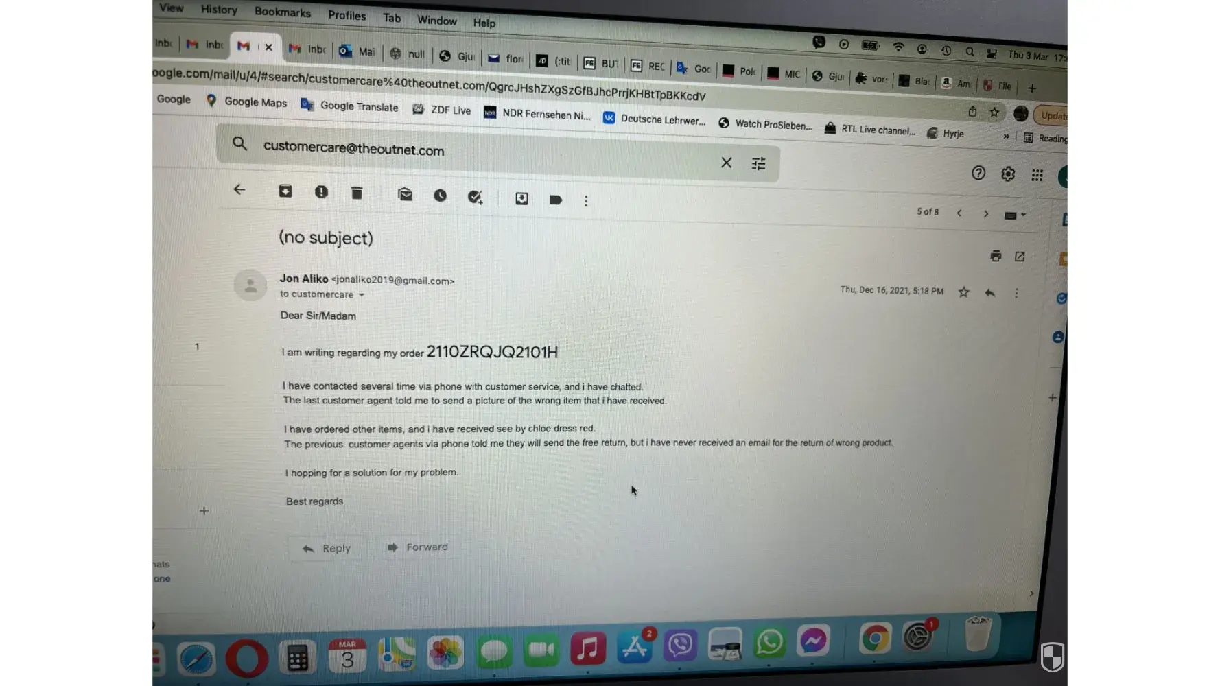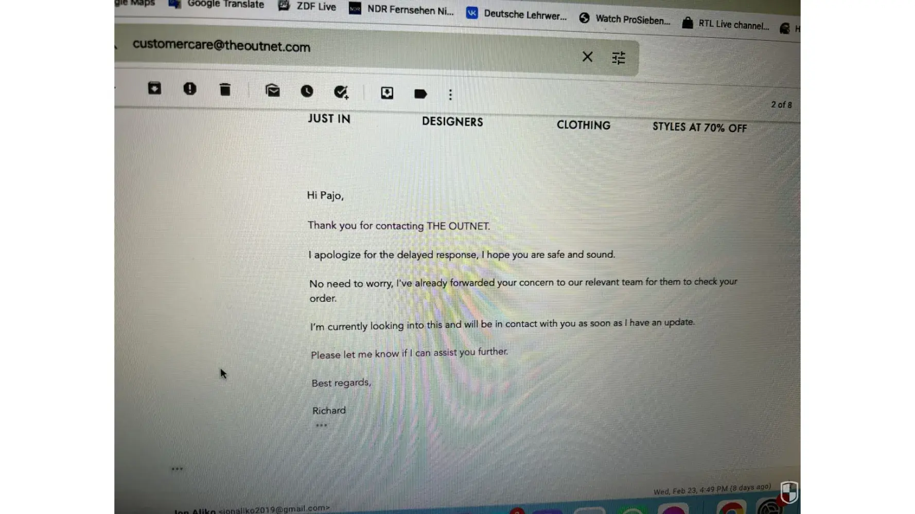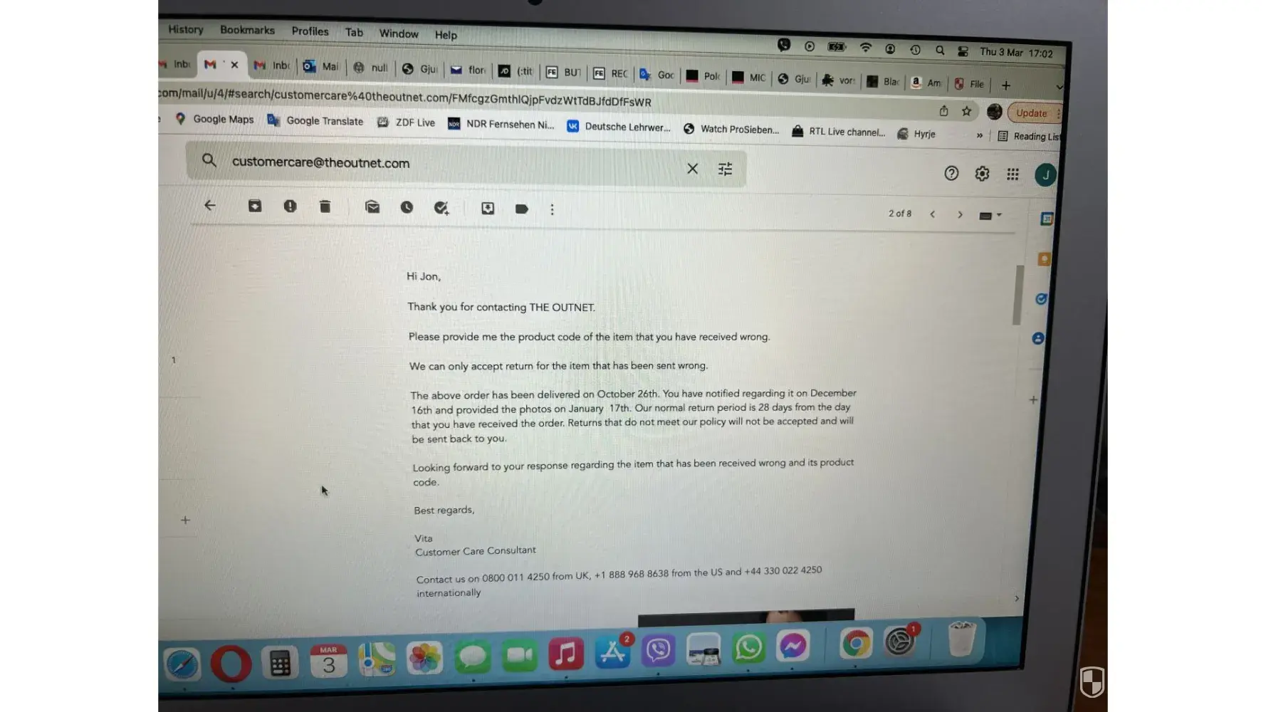 Below i have attached emails with theoutnet, but the chats and the phone call i have no photos.