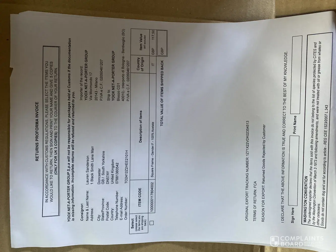 Neglecting return parcel held at cusoms