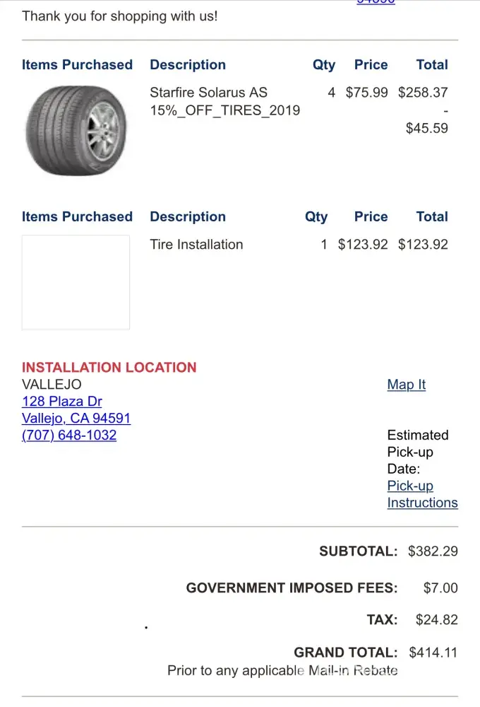 Misleading tire sales I had made an online purchase for 4 tires at the store in front of clerk. Order #[protected] on 12/03/2019 I received my online receipt for a grand total of $414.11 including taxes I did ask about a veterans discount of 10% which I was told when I made payment I would receive it. I asked if I could do it two days later in which the...