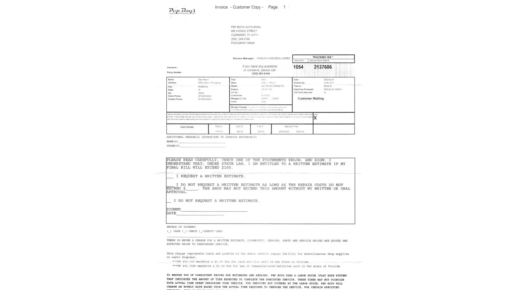 Read full complaintService and charges at Pep Boys 1703/Spring Hill, FL