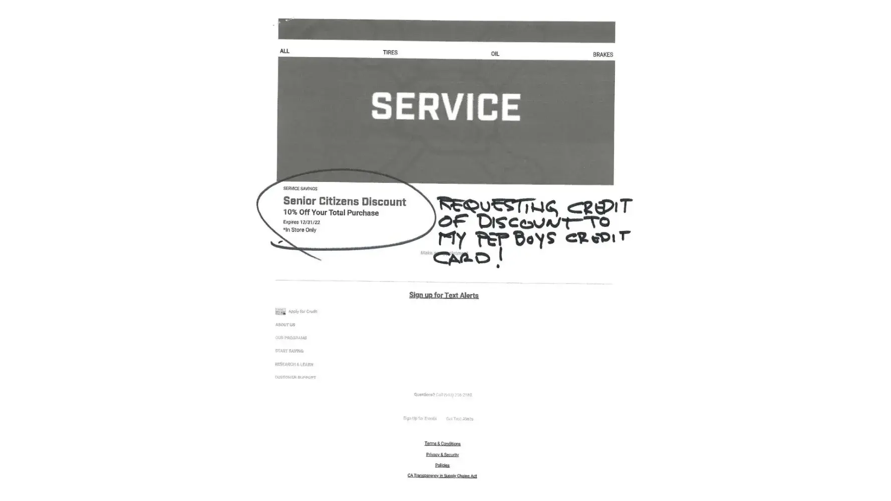 Desired outcome: I would like to get my 10% Sr Discound credited to my Pep Boys Credit Card purchase.