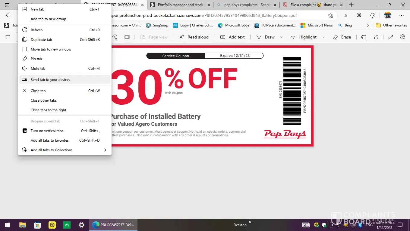 When I arrived, the young lady wrote up my order and I showed her the text. She notified the manager who advised me it was only 30% off installation fee of $14.99. I explained the coupon says "30% off and installed battery". He refused to honor it, saying it's only for installation fees. I left the store and cancelled the order because the coupon is clearly for the battery. I went to the nearby Lincoln dealer and had a battery installed. Someone from PepBoy contacted me and I forwarded the text to him at 24376. He indicated he would get back to me. Additionally inquires to that 24376 number go unanswered so I am notifiying you of this unsatisfactory incident and your failure to honor coupons.