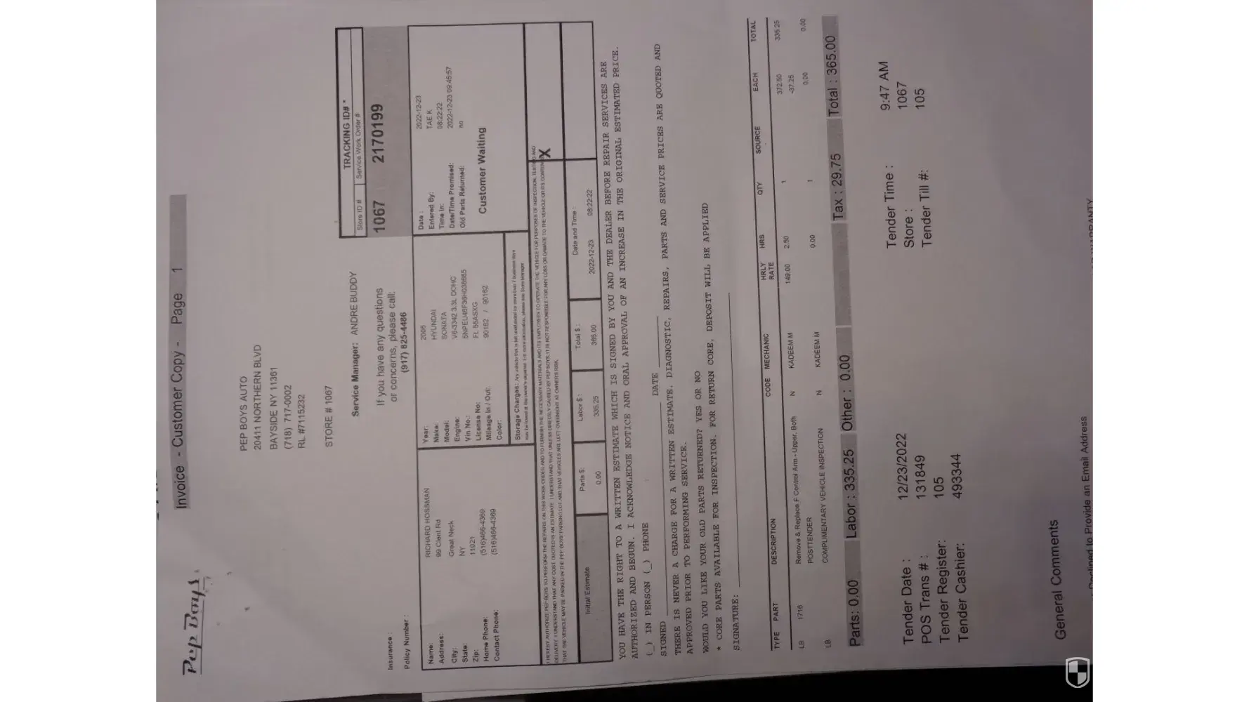 I took my car into Pep Boys Auto in Bayside, NY on 12/23/2022 to have both Front Upper Control Arms replaced. The time in on the work order (w/o # [protected]) was 8:22am, the tender time was 9:47am. Accordingly, the maximum mechanics time working on my vehicle was 1 hour 25 minutes. Maybe he also took a break – who knows? I provided my own parts.