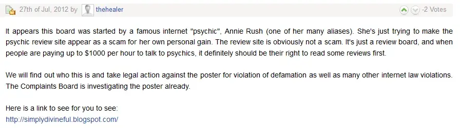 i have been reading this and other sites about this forum. i to have fallen prey to these vicious people. what thehealer writes on here is untrue. i have asked for comments...reviews to be taken off because they are untrue. registered for site and nothing was ever removed. so for thehealer to say just register and we will help you is a lie. thehealer just wants people to register thats all. ive flagged the comments did everything contacted the admin you name it i did it. never even gotten a response. that forum is full of lies about psychics. when a timing doesnt come out those people trash you. psychics are not god. timing can be off and also free will. i have told a few of the ones that post on there that call me in the readings not to do certain things and they do them. then when it all falls apart its the psychics fault. these folks do not want to improve their life. the psychic reviews is just a place to vent to spit out their anger. and yes its true they only talk about certain psychics on there. if anyone goes against those psychics they are either banned or the responses are accusing you of everything under the sun. thehealer does keep a database as he wrote above. one of my friends who is a psychic on CA wrote in to complain. a few of the comments were deleted then later came back on. so thehealer is not a honest person or the forum a honest place. now that the truth has come out about this place my call volume on the line i work on is beginning to come back after what the psychic reviews did to my name and business. the truth always prevails! the things that forum has done to people in our field is disgusting. but karma always turns its head and it will come back to all of them. you dont set out to ruin a persons business by reviews filled with lies. how does thehealer know if what those members on their are saying is even the truth about a psychic? i agree with the other posters there is no moderation and its like thehealer is the adult of the forum by making it but thehealer leaves the kiddies to play unattended. dont listen to his comebacks on here that they are honest place. every comment on here you notice thehealer advertises the place. thats all thehealer is concerned wtih. there is no lawsuit going on. if there was there would be much for what thehealer would be held accountable for his site. this is a complaint site and anyone with a complaint can write on here. so pls save it thehealer with any response you will have to my post. your forum went in to destroy many psychics but lies not truth. i am looking forward to the day the dark place called the psychic reviews will be taken down. its coming. all of you that are apart of this forum should start studying universal laws. what you give out does come back. in a much harsher way.