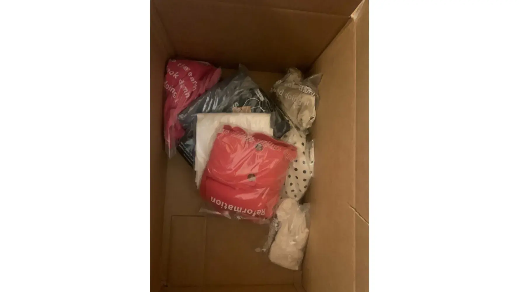 reformation shipped the package using fedex smartpost and upon receiving the package I noticed the front of the box tape and back of the box tape color is different. also it was really lightweight so I went into fedex website and found out that package was only 1 pound upon delivery. I contacted reformation customer service and they refused to refund me for missing items despite having definite proof that items weren't shipped in full.
