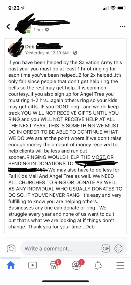 I have seen Deb of Olney IL Salvation Army post on Facebook that unless you are ringing the bell and collecting donations this year she will not be allowing those to get help in the coming year. This includes those who are disabled and elderly (expects family or friends to do it) or children on the Angel Tree. She is has said she will keep their Angel Tree...