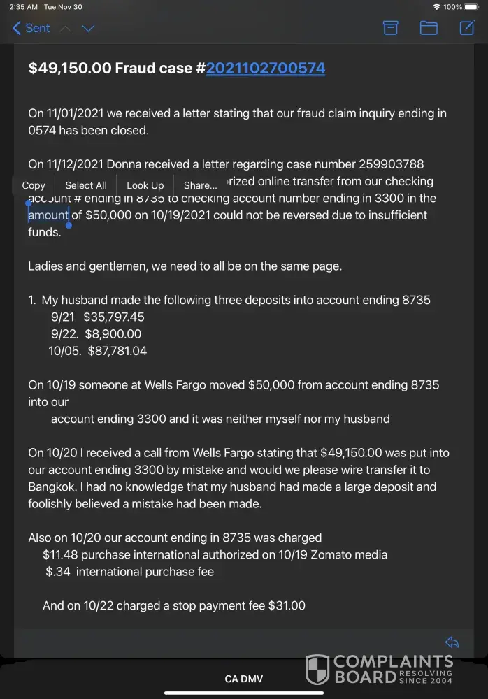 I expect further diligent investigation by your fraud department as well as the local Wells Fargo branch. I will also be contacting the F.B. I., the F.D. I.C., and the Consumer Finance.gov