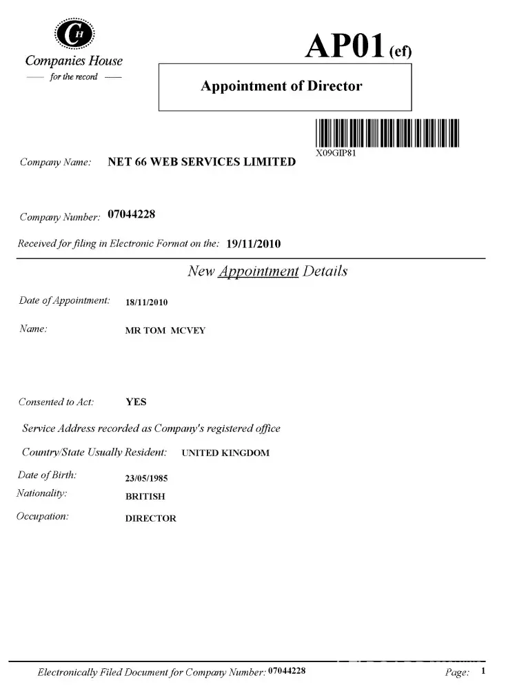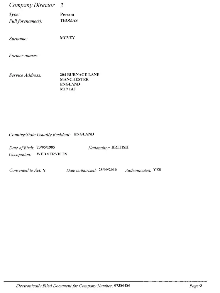 Referring to the attached, un-edited pages, from documents of Incorporation and Changes of Director Details, we can see that even on official documents, submitted to a government department, and on which the very existence of the Ltd. companies rests, Tom McVey lies. He records two different Dates of Birth.