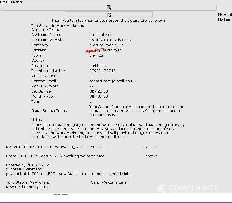 I have previously posted documents proving that The Social Media People failed to record my details correctly, and failed to send me an ‘Order’.