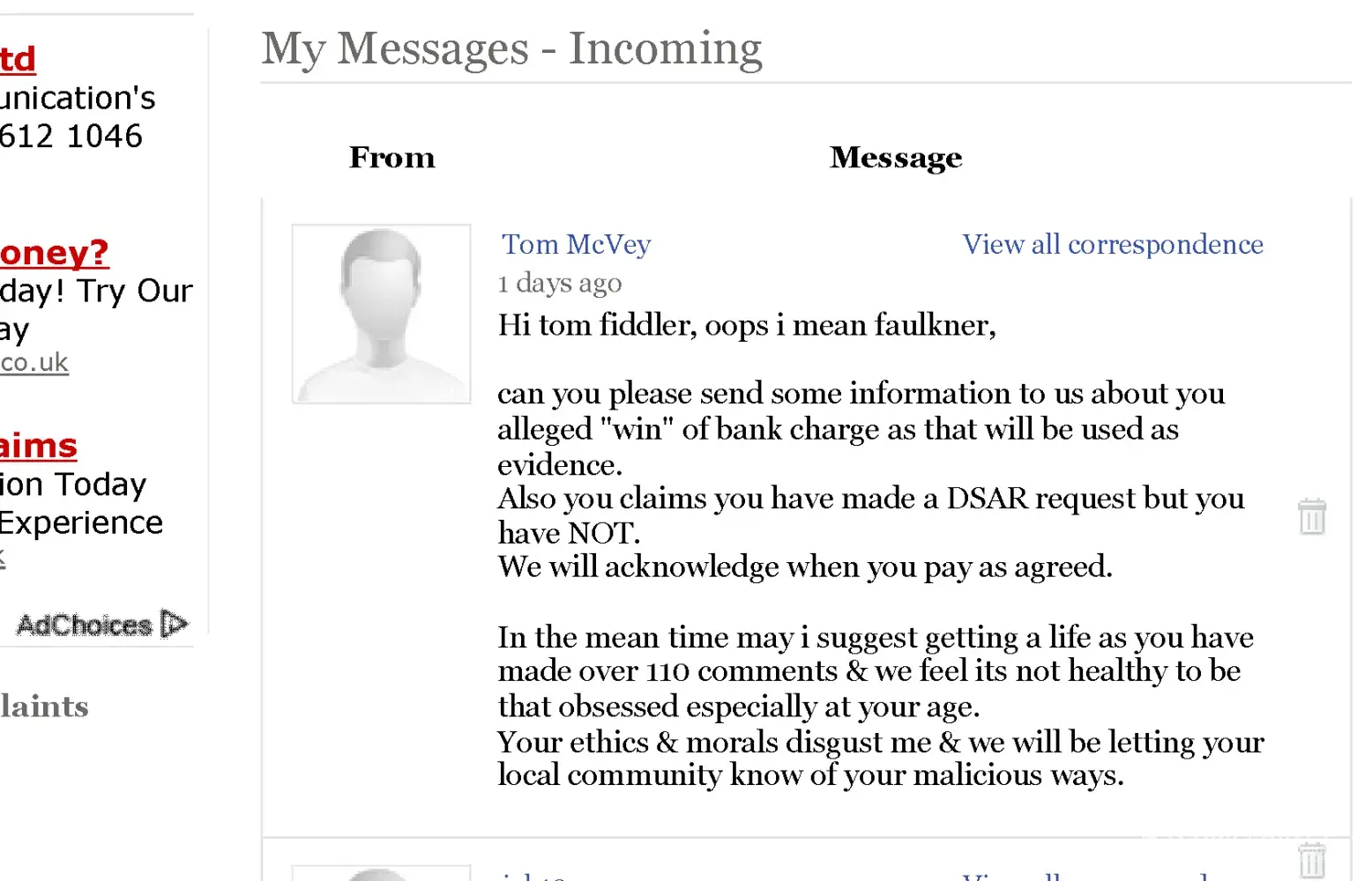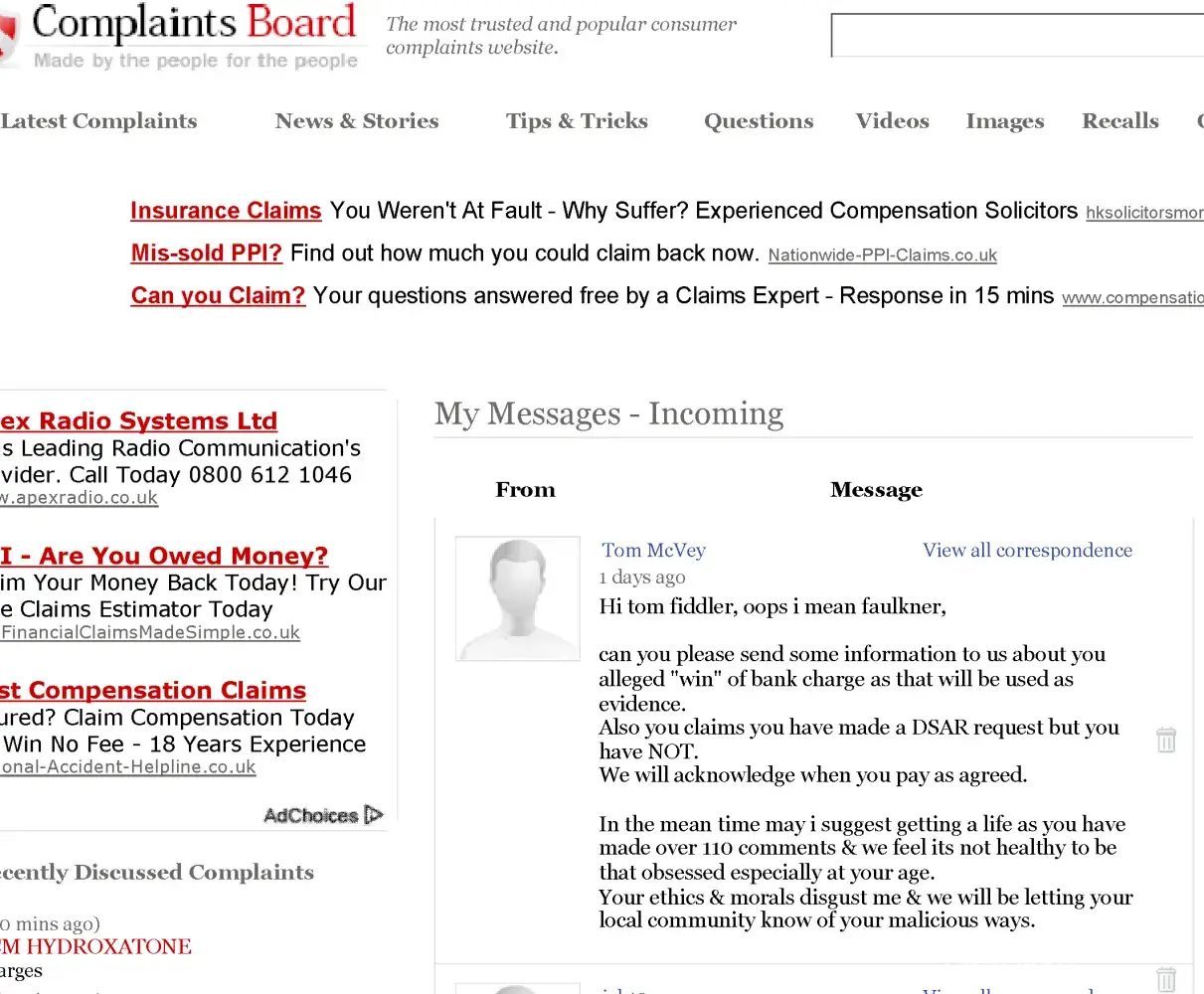 Please have a look at the attached image of a Personal Message I received via complaintsboard.com, on 12-07-2011.