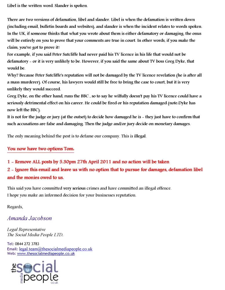 16-07-2011: The Social Media People threats of legal action. 1