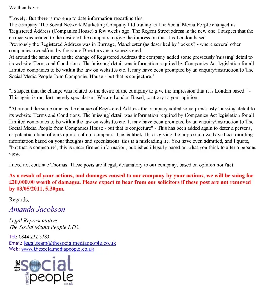 16-07-2011: The Social Media People threats of legal action. 2