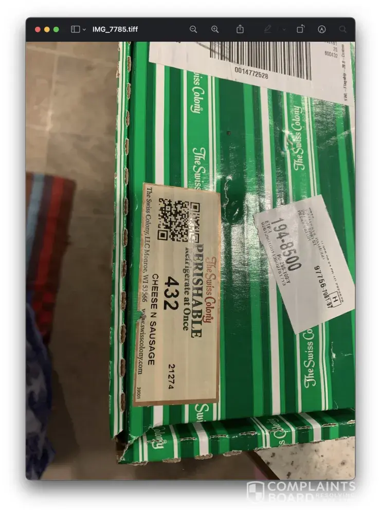 We received a gift box from our daughter, as we do every year, on Dec 20th and immediately put it in the refrigerator. The brick cheese and cheddar cheese were moldy and were discarded. This is the first time we have had any problems with Swiss Colony products in over 25 years. This is just an FYI so you can do a quality check of inventoried product.