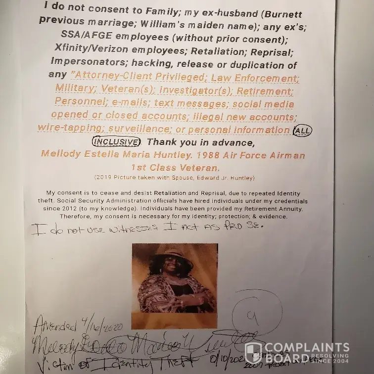 I do not consent to (any family; ex-husband; no exe's; outsider's; ssa/afge employees) without "my" prior consent; impersonation; retaliation; reprisal; hacking; duplication; or the release of any attorney-client privileged; ssa/oho personnel or retirement annuity; personal & banking; investigators; law enforcement; military; veteran's; social media; wiretapping or surveillance open/closed accounts information (all inclusive). Thank you in advance, mellody estella maria williams-huntley, proving identity.