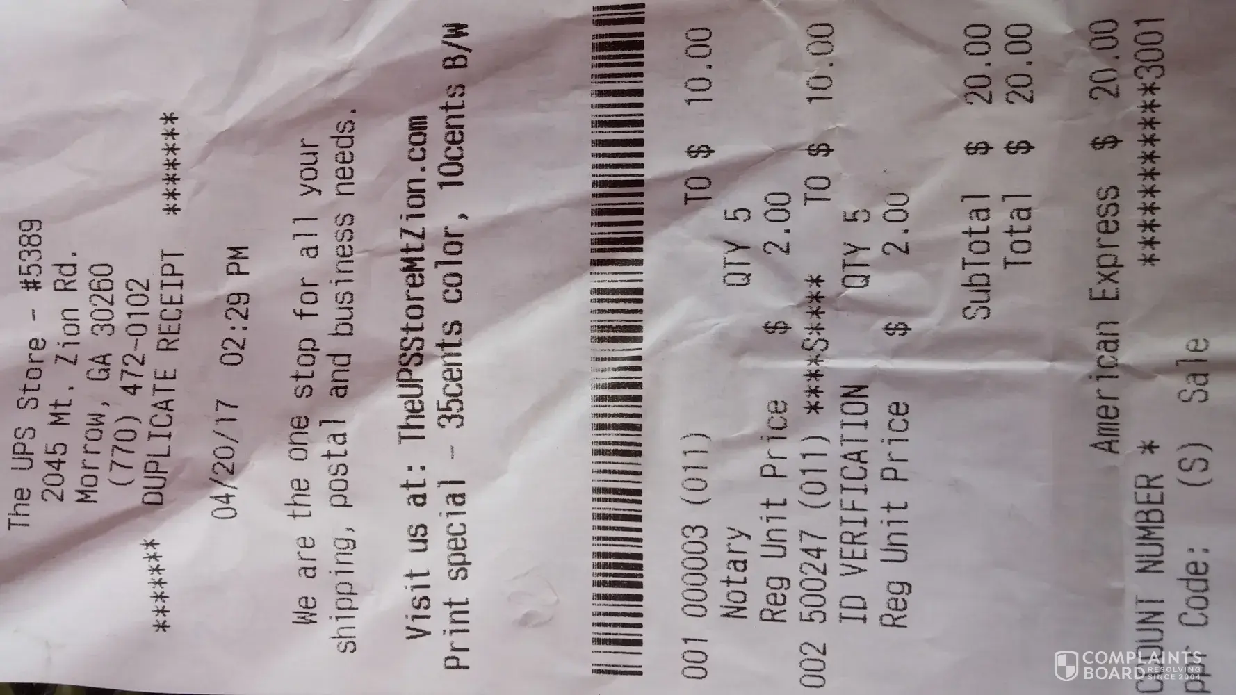 So on April 20th 2017 I went into UPS Store on Mount Zion Boulevard Morrow Georgia to house some forms notarized for insurance company I was not aware that there is a maximum charge in the state of Georgia for notary which is $2 I asked the gentleman what it would be he said $5 he said you have 4 pages so that'll be $20 period I got a receipt stuck in my pocket when I got home I told her friend what it cost to have the form notarized he said why they're much they can only charge $2 a page so I called UPS corporate for the UPS Stores this morning I get a phone call from a female I'm guessing with that particular store she said we charge $2 a page and we also charge $2 for your ID verification when I called the state of Georgia they said that's the purpose of notarizing and part of the notary is that they ask for your ID and they are not allowed to charge extra for that so it's only $2 so I was charged $20 for notarizing 4 pages and it should have been $8 this store is obviously doing this continuously and it is against the law and I do have the receipt when I called Clayton County which the state told me I needed to do clerk of superior court they said they only issued the notary they do not control the prices I told the lady the state plainly and clearly controls the prices in the state told me is up to you guys to prosecute but once again she didn't care