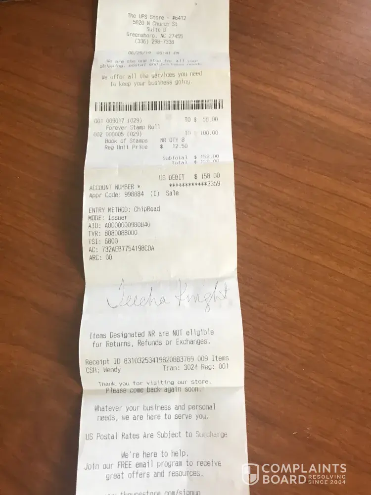 On 6/25/19, I purchased 150 stamps from the UPS Store #6412. While the total charge was $158, I was unable to calculate at the moment the cost for each stamp. When I arrived home, I calculated the cost per stamp and was not pleased with the amount charged. The receipt shows I can not return the 8 books of stamps given, but I can return the Forever Stamp Roll.
