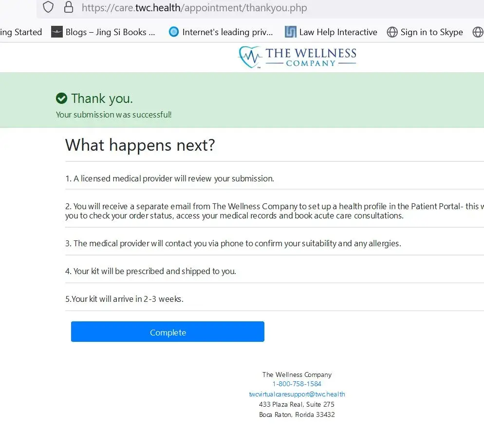 I purchase their $299 medical kit for ivermectin, hydrochloroquine, and other emergency medications plus a handbook for use. The kit requires an intake form, which I filled out. I obtained my receipt and the email sent was that I needed to complete the intake form. However when I try to complete it again, it said it had been completed. Ten days later and there is no contact or call back by any health professional (they say they will call you prior to shipping). They urge you to set up an account at Charmhealth.com, and telehealth type of office. However all that shows is the medical kit, and apparently a Dr. Madsen has reviewed something the day after the order was paid. There are no follow up messages, just junk mail from The Wellness Company. I am cancelling the order through my credit card, but I am unsure this will go through. They have a "nonrefundable clause" that the victims must check the box off. It reads: "I understand by filling out this form a clinical provider will call me to verify the answers provided and will determine the suitability of the requested subscriptions for me based upon the information that I have provided. If deemed unsuitable, my request will be nonrefundable. I understand that if I have filled out an intake form on someone else's behalf, I have provided their contact information so that they may speak directly with the provider." Okay, since no one even tried to call me, I guess that I do qualify for a refund. I can call them or chat with them, but I think I just want the refund and the other reviews at TrustPilot say when you talk with them, they still take off $50.00. So apparently they probably regard your conversation as a "consultation." What a rip-off! Please, buy your ivermectin or fenben from a petstore. If you are desperate, I guess you can wear a nicotine patch too. You don't need a prescription to obtain a nicotine patch.