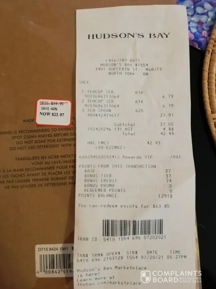 Hello, on July 20, 2021 I made a purchase at Hudson's Bay company. I bought set of Gluckstein Tea spoon. The package is supposed to have 12 pcs of spoons. After opening the package, I found out four spoons are missing. The set was on sale as you can see from the photos attached to this msg. I wanna return it but to make sure nobody accuses me steeling missing four spoons! Thank you very much for your response. Jarmila