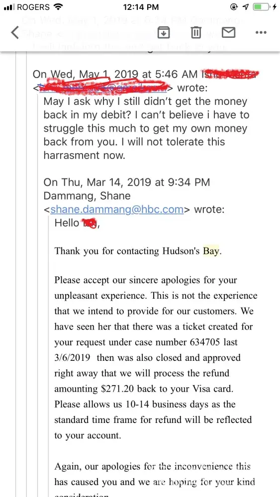 Worst customer service ever! You guys started scamming customers now. I am struggling to get my return refund for months. Got several emails from manager and his team confirming that we have processed your refund and you will get it back but never got the money back to my card and now they stopped replying. I had my refund amount in Hudson bay gift card from store and I requested your customer service team if I can get that money transferred to my debit card as I was going back home and might not return back for months. He agreed and canceled my bay gift card amount and said he has processing funds in my debit. I contacted several times to support. I got apologies all the time but never got refund back in my card. Now they stopped caring about my emails. I need immediate response and action on it. Otherwise I am bound to take an action on it. case# 634705 and case 622614
