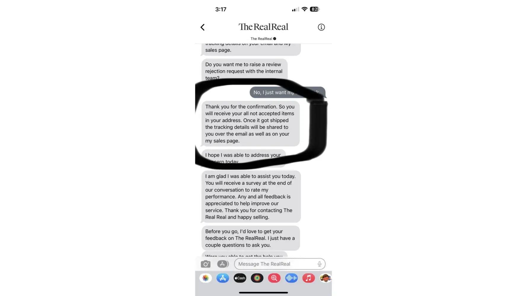 Desired outcome: I want my items returned to me ASAP and transparent communication from TheRealReal. If TheRealReal lost my things, I want to be paid the total retail amount for the two items.