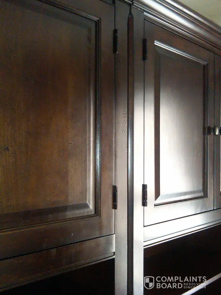 was "heritage-type furniture". The TV cabinet has slides that permit the doors to slide into the unit out of site while viewing. They are oozing a black, tar-like substance and it is smearing onto the front of the doors since they touch this material when recessed.