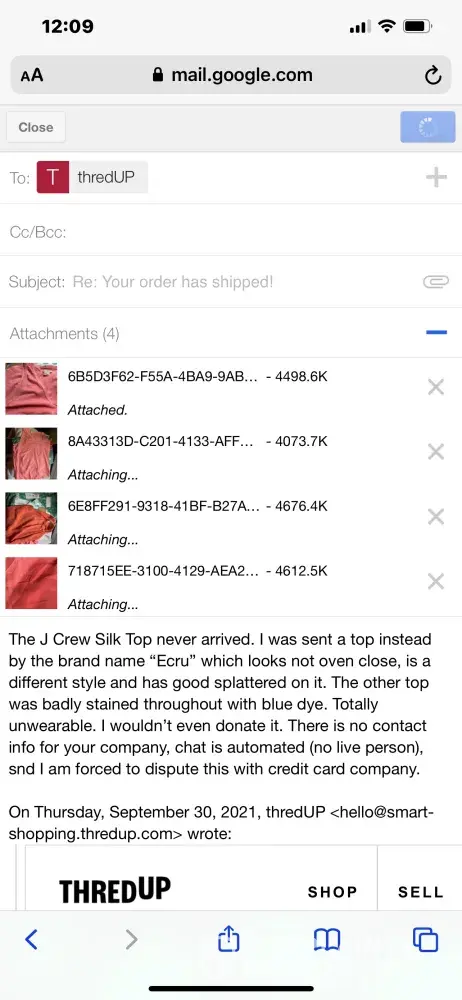 ThredUp has no contact number or email. Their chat is automated. There is no way to contact them for a refund. ThredUp sent the wrong item. It was totally wrong-the wrong brand, style, color, etc. Additionally, it was dirty with food on it. I initiated a return but realized I would owe ThredUp money with their $2 restocking fee and $9 shipping. The only refund ThredUp offers is a store credit. ThredUp also describes items incorrectly. I received a shirt that was described as embroidered. Instead, it was covered in a gold metallic 1980's splatter. Couldn't contact