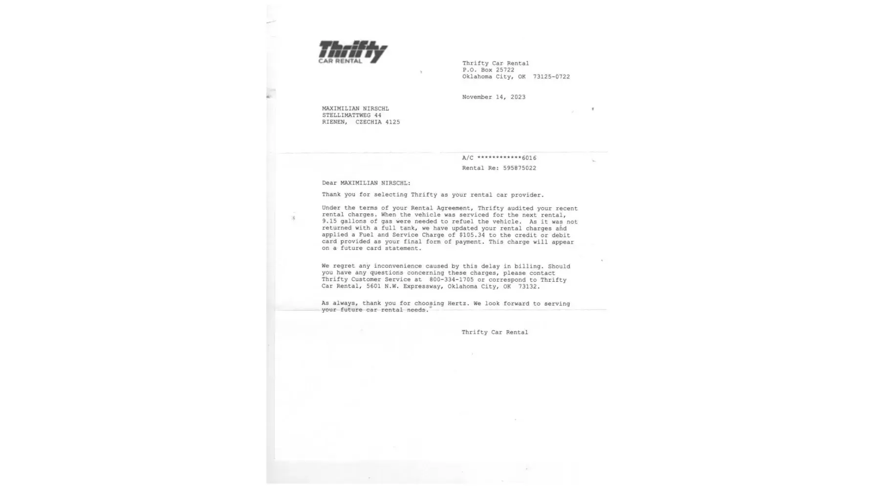 I drove 716 miles and the car consumes around 3,8 Gallons per 100 miles, mostly driven on highways with no more than 60 miles/hour. In total I must have used around 27,4 Gallons of fuel, and the last portion of 6,65 Gallons (see credit card statement and calculate with 3,2 USD/Gal) I filled up on Nov. 11th right 20 minutes before return. There was neither time nor possibility to empty another 9.3 Gallons out of the tank, otherwise I would have driven more than 716 miles! In addition your letter is adressed to Czechia, and I am NOT from Czechia. Why it reached me anyway is due to the „search-service“ of the postal service. So I guess either you mixed me up with somebody else or a fraud attempt is under way! In addition you can look at what mileage the next rental started! This will tell you how many miles the car was driven AFTER I had returned it! And nobody can drive out of the rental car station unless he has authorisation for that! I hope I have pointed out very clearly that it was NOT me who has emptied the tank or has consumed another 9.3 Gallons of fuel, if this ever happened and not only claimed! Charge whomever you want but not me! I will reject any further charge on my creditcard! You have no chance to proof your false allegation! I will never rent with Thrifty again!