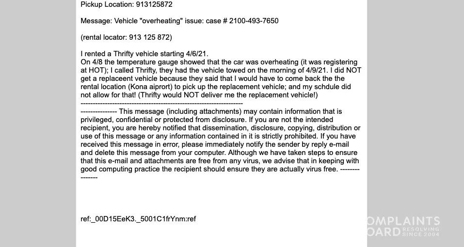 I emailed the company twice with this information, and asked for a refund. The company "auto" replied to my email, so they definitely received it! I never received another response; so I cancelled payment with Visa. Visa reviewed my email to Thrifty, and then called the company to discuss. Visa then gave me full credit.