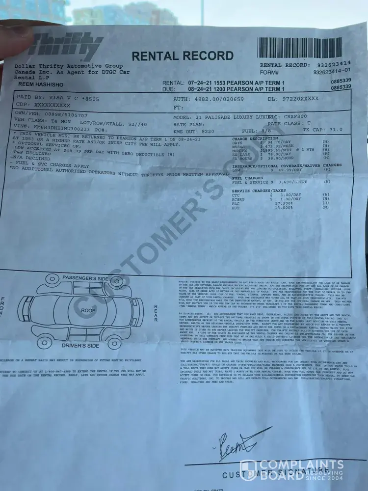 I rented a car from Thrifty Pearson Airport in Toronto on the 24th of July 2021 till the 13th of September 2021 but I was surprised that I was overcharged on my card with an amount of 8700 canadian dollars. I delivered the car with a full tank Abd as received. As agreed with them, I had to call after one month to extend and I did in the 24th of August . I was surprised that extra charges appeared on my card that was already deducted and leaving me with the problem to pay the bank for the charges that occurred with the false billing of thrifty.