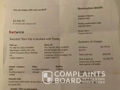 I reserved a car rental with Thrifty car rental at Dulles Airport in Washington DC. The rental agreement was for 34 days for a stated total of $1119.61 plus $383.09 tax and fees for a quoted total of $1502.70. When I arrived to pick up the car the agent told me I MUST purchase insurance. My Capital One Venture card provides additional insurance but he said...