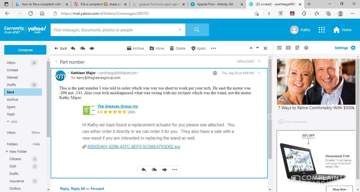 The tech seemed not to know what he was doing and called office several times for help. This loveseat has lumbar and head rest controls along with the lift. Tech decided it was the motor. Kerry sent me an email link with the part and company to order part from. I ordered part from Hong Kong for $170. The tech came back when the part came in. Motor was not the correct one, was way too short. I asked him to check the wand, which I had asked him to check before. Come to find out it was the wand and did not need motor. I talked to Kerry at the Greaves Group and asked him for a resolution for this. This company will not take returns/ He said I ordered the wrong part or the company sent the wrong one. I sent Kerry a copy of the receipt, the email he sent me with the part to order and a picture of the part I got. They both matched. I asked for a refund for the $25 service call that I paid for a misdiagnosis and the $170 for part I was told to order. After sending him all the information, Kerry will not answer emails about getting a refund. Also, left me hanging with no repair.