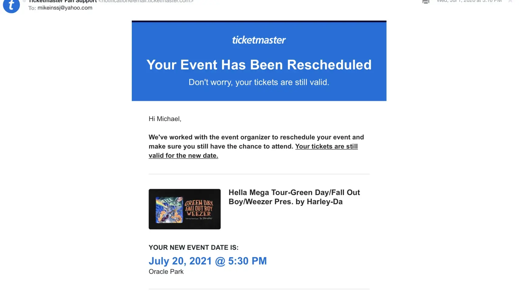 I understand the pandemic has created turmoil in the entertainment industry and I am really trying to work with Ticketmaster on this before it gets too close to the date and all hope is lost.