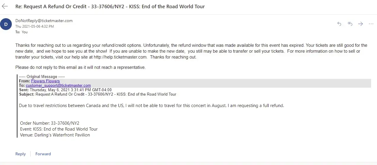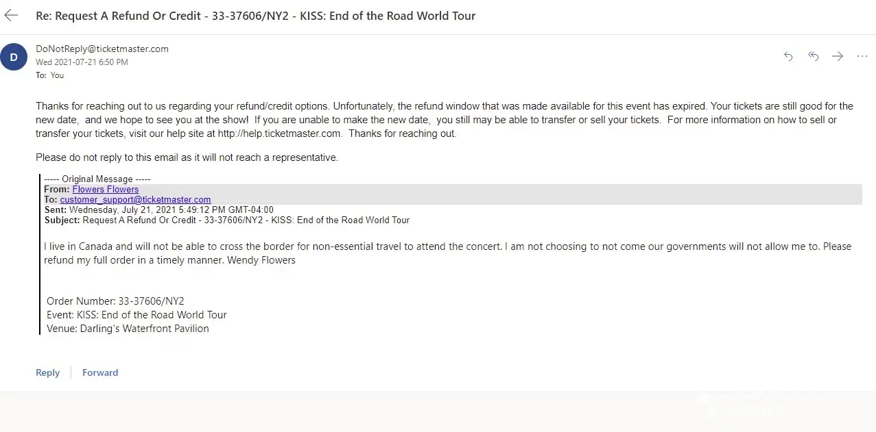 I purchased 2 tickets in 2019 to see a KISS concert at Darlings Waterfront Pavilion in Bangor ME on September 3, 2020. Due to the pandemic the concert got rescheduled for August 19, 2021. I live in Canada and due to the "non-essential" travel restrictions in place with the US government, I am not allowed to enter the United States. I have reached out to Ticketmaster several times in the past few weeks and always get the standard auto response " your window to request a refund has passed, your tickets are still valid, hope you enjoy the show" I would love to enjoy the show, if I could enter the country! I did not take advantage of the refund opportunity emailed to me in July of 2020, because I was hopeful that travel between Canada and the US would surely be resumed by mid 2021. WRONG.