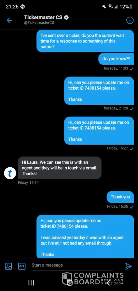 I have opened a new account "[protected]@gmail.com" to try to contact Ticketmaster but the processes for updating that account are the same which is no help.