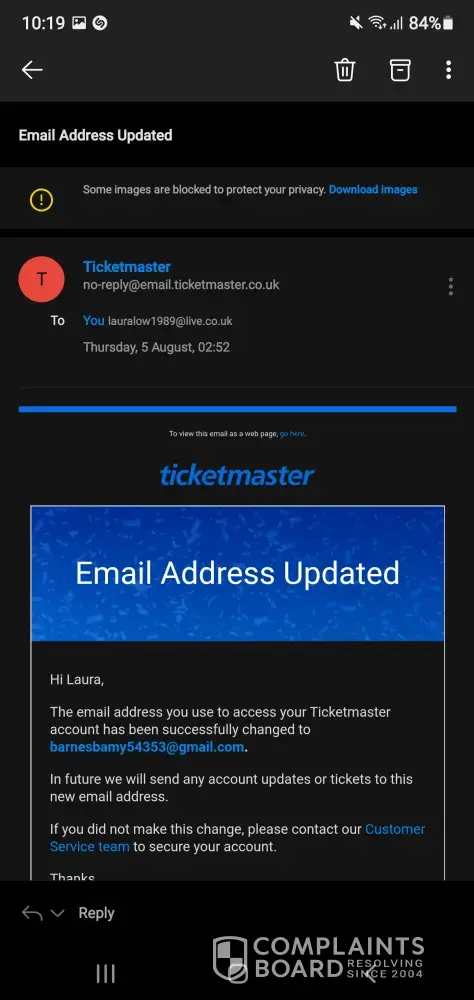 The hackers email address is [protected]@gmail.com and managed to change my email address without my consent and ticketmaster have made no attempt to take it seriously.