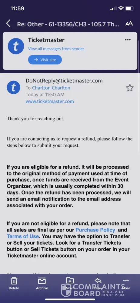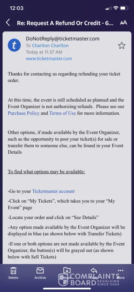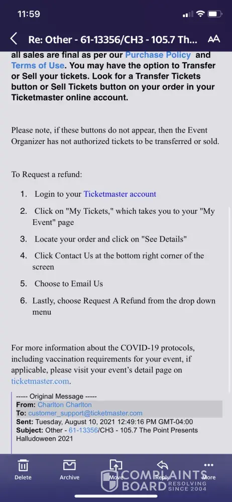 Ticketmaster refund order#4-31940/atl
