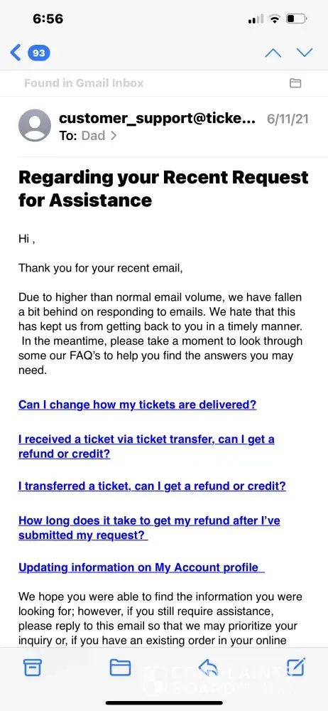 We are working hard to keep pace with an unprecedented volume of inquiries as our industry and teams return. We wanted to let you know that we are currently prioritizing inquiries on events happening within the next few days to ensure fans with the most urgent needs to receive a response ahead of their event date.