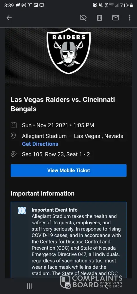 August 5th, 2021, I purchased 2 tickets to the November 21st, 2021 Bengals at Raiders game. Eleven days later, Allegiant Stadium instituted a policy that anyone entering their Stadium must have received their vaccine. This was obviously not disclosed at the time of purchase because it occurred 11 days later. I am requesting a full refund of my 2 ticket purchase in the amount of $1, 169.15.