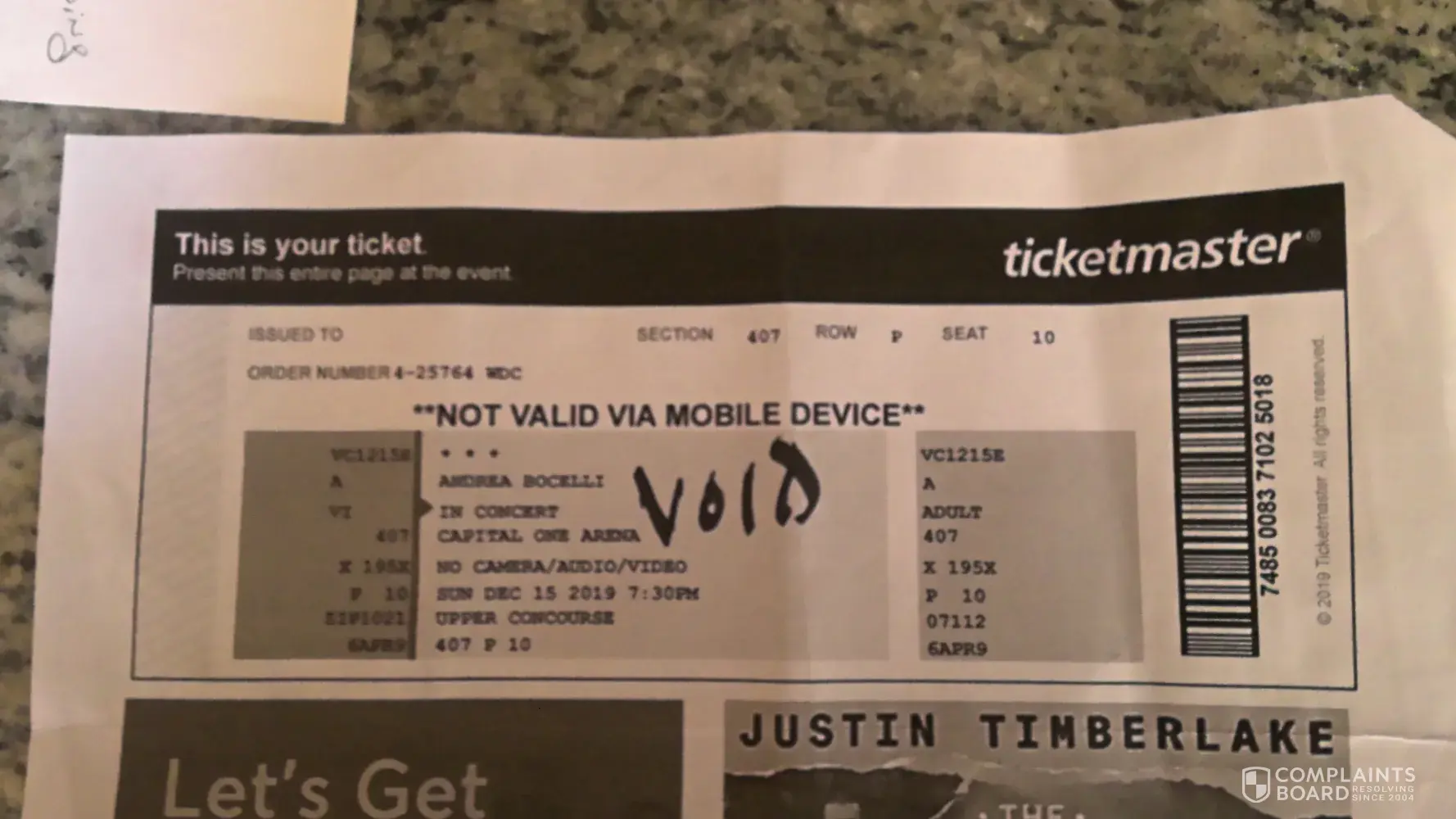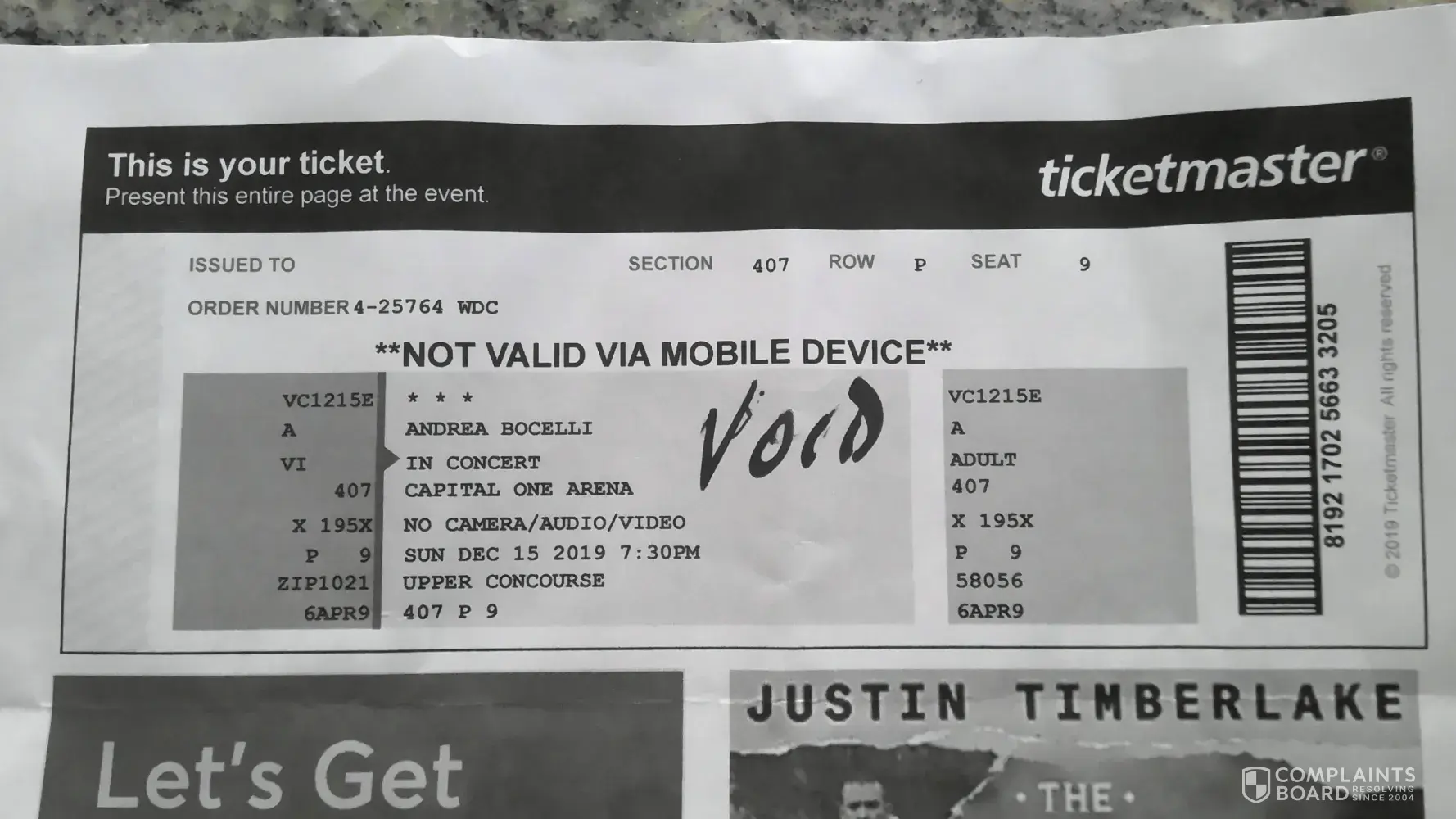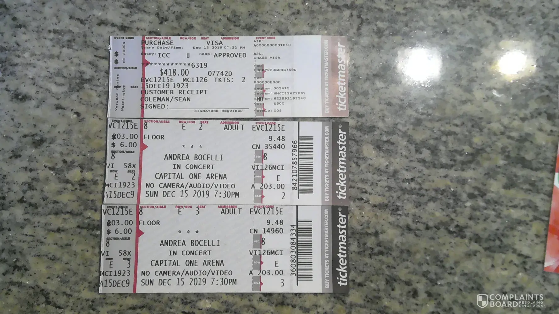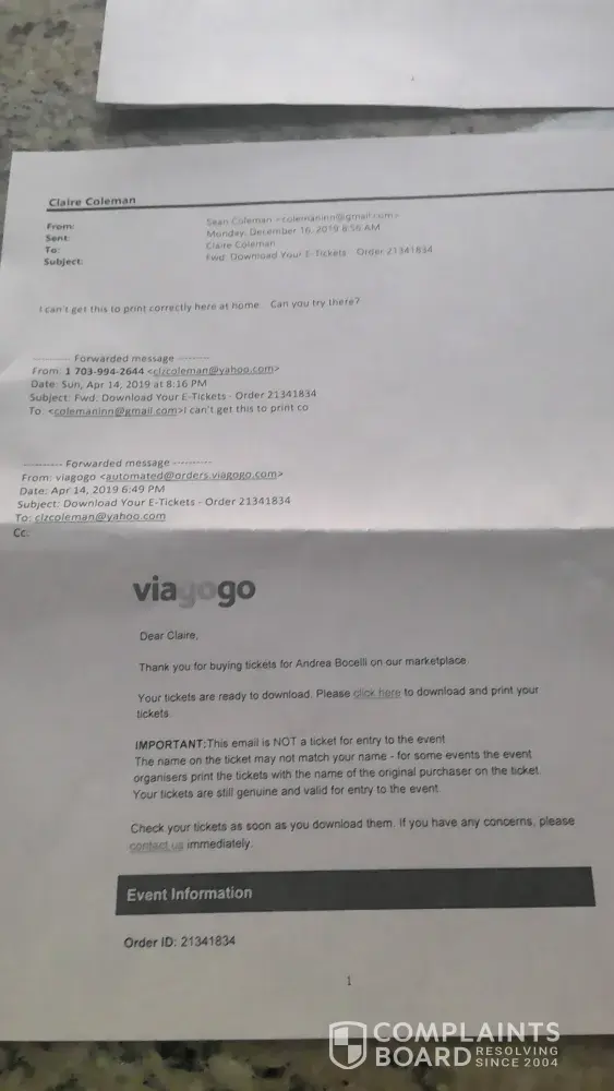 In Re: Andrea Bocelli Concert at Capital One Arena on December 15, 2019 To Whom It May Concern: We purchased tickets to the Bocelli concert on April 6, 2019 with our Chase Visa card. Tickets were emailed to us that same day and we were instructed to print the tickets. The email from Viagogo said that the tickets were genuine. We paid $319.83 for the...