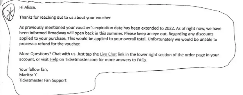 I received an two emails from ticketmaster saying that my voucher which was used for a cancelled play, was extended until 2022. When I recently tried to confirm this again, I was told that the voucher expired 2020 and I could no longer use it. The issue is that ticketmaster told me it was good until 2022 and so based on the information they gave me, I believed it was good until 2022 and had time to use the voucher. They refuse to acknowledge this even though I sent them proof of their emails, and keep reverting to their argument that the voucher expired in 2020.