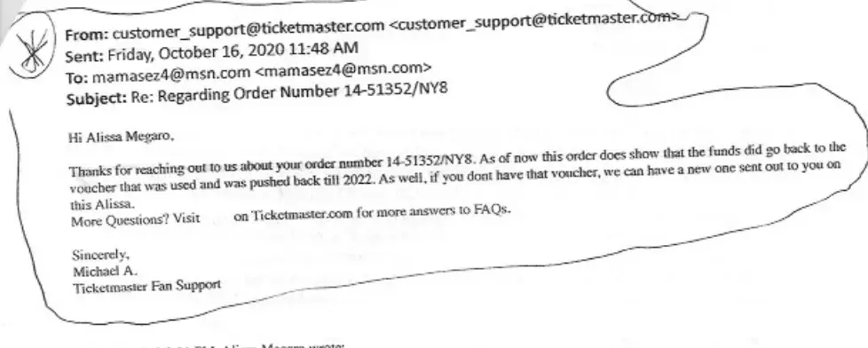 THE SHOW I BOUT TICKETS FOR WAS POSTPONED TWICE. THEN I GET AN EMAIL ASKING IF I WANT A REFUND. I FILL OUT THEIR FORM AND THEY SEND ME AN EMAIL THAT SAYS: