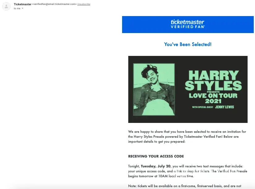 Ticketmaster issued me an email on Tuesday, July 20th at 4:01pm titled, "Your Invitation to the Harry Styles Presale powered by Ticketmaster Verified Fan" stating that I had beed selected to receive a presale code for the Harry Styles Love on Tour 2021 presale for the additional Nashville, TN tour date on September 29, 2021 at Bridgestone Arena.
