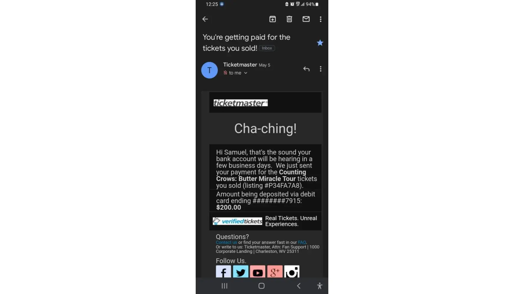 Hi Samuel, that's the sound your bank account will be hearing in a few business days. We just sent your payment for the Counting Crows: Butter Miracle Tour tickets you sold (listing #P34FA7A8).