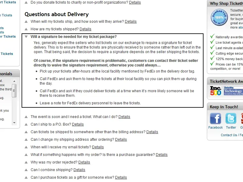 In regards to the signature requirement, many ticket sellers do indeed require a signature for ticket packages due to the fact that event tickets tend to be pricier items and also due to the fact that tickets are often irreplaceable. We mention this fact on our website in the FAQ portion (see the attachment). The decision as to whether a signature should be required on a package is up to the seller - some sellers don't require a signature.